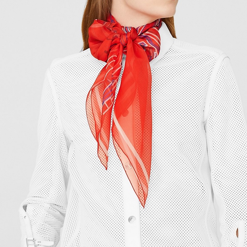 Hermes names 55cm scarf as bandana. Tie it on your hair or wear it around your neck in cowboy (left) or double knot (right) style if you do not feel like wanting to wear any jewelry for the day. 🙂